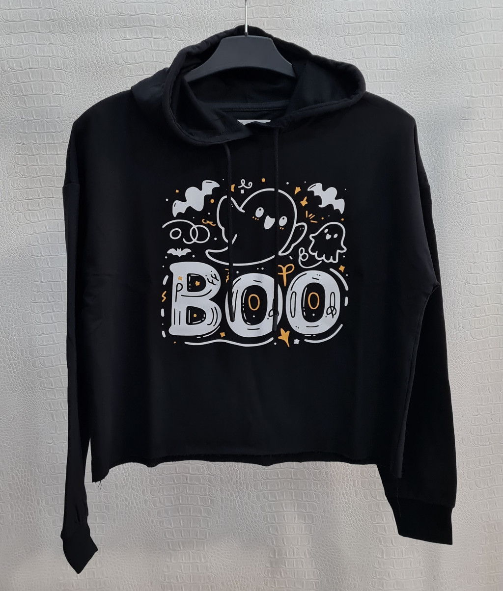 A kapucnis pulóver egyenes szabású, rövidített, alja vágott crop fazon.